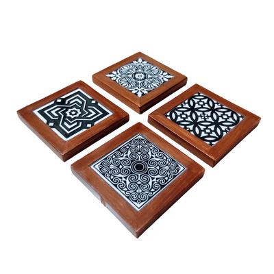 Teakwood Coasters (Set of 2) with Black & White Ceramic Tiles