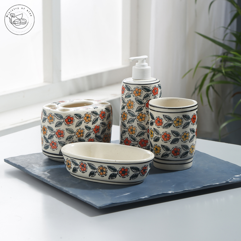 Ministry Of Klay Hand Painted Ceramic Bathroom Accessories Set for Utility and Bathroom Décor | Soap Dispenser | Soap Tray | Brush Holder | Tumbler | Set of 4.